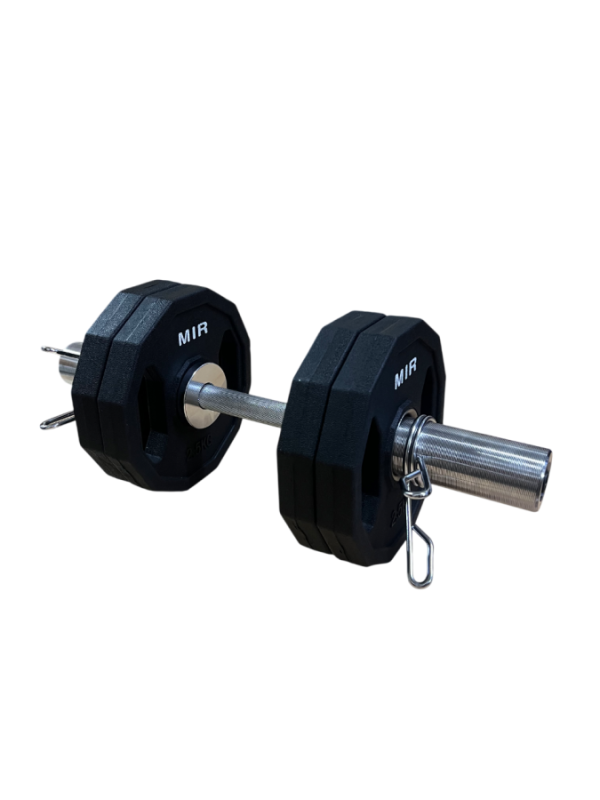 MANCUERNA OLÍMPICA 50MM CON TOPES + 4 DISCOS OLÍMPICOS HEXAGONALES DOBLE AGARRE 2,5 KG C/U MIR